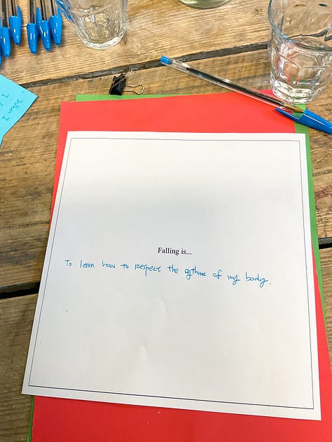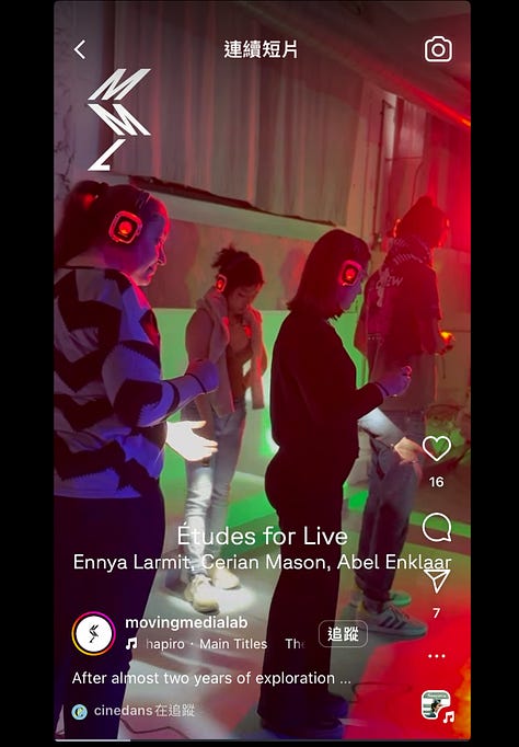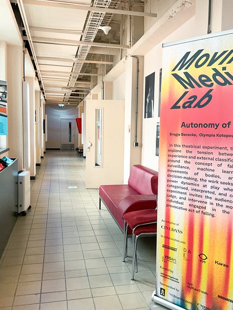 除了影像放映,Cinedans也將觀眾帶入A-Lab的空間實驗。Moving Media Lab聚焦舞蹈、設計與科技的交錯,邀請觀眾從「觀看」轉向「參與」。我參加的導覽中,一件作品以silent disco形式進行:觀眾戴上耳機,跟隨聲音指令在空間中移動,逐步覺察自身的身體感。另一件裝置則讓人圍坐在會議桌旁,觀看螢幕上舞者不斷跌倒的即時影像,並被要求在紙上回答:「對你而言,墜落是什麼?」這些作品將舞蹈從美學轉化為哲學,使身體成為思想的觸媒。